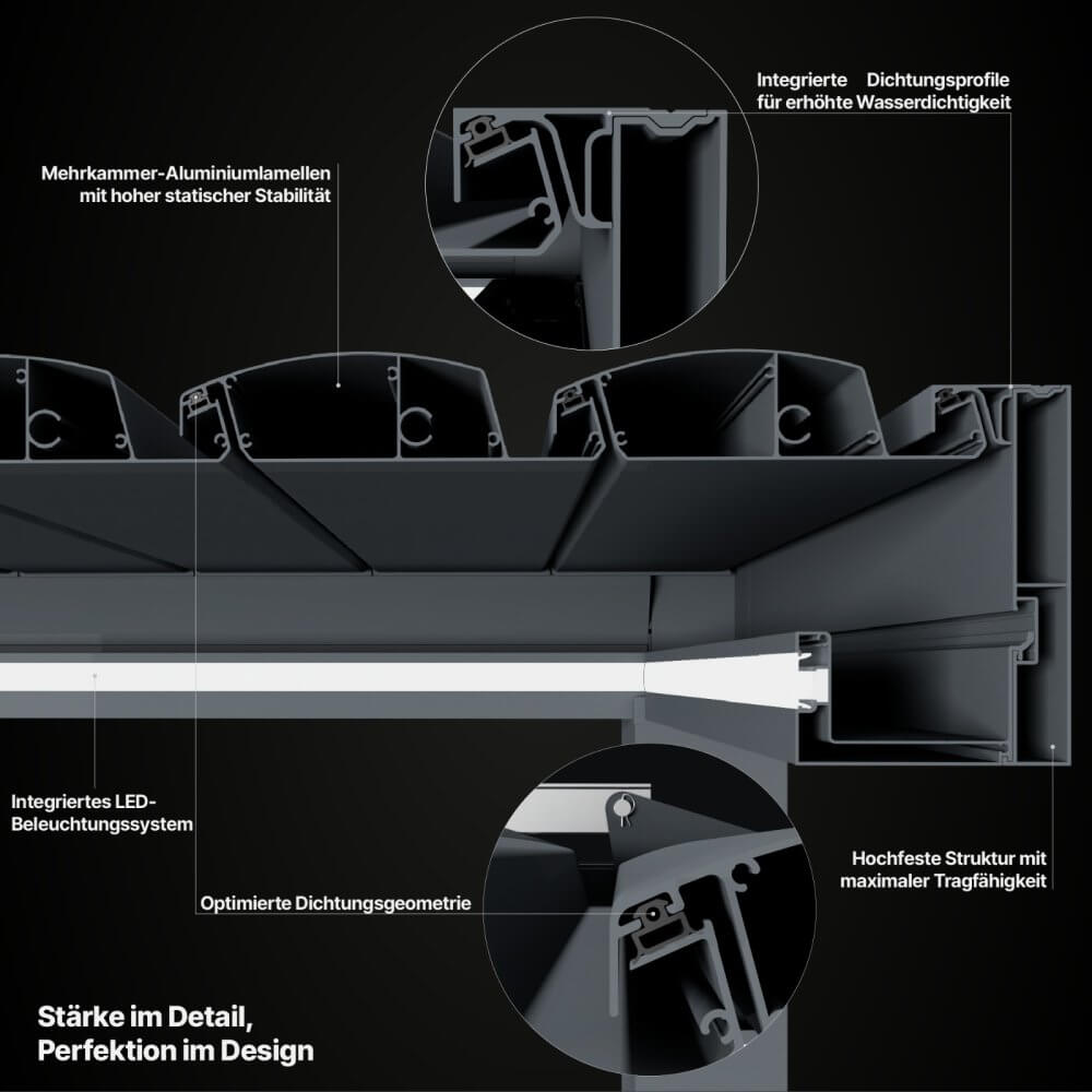 Die robusten Beschläge unserer Aluminium-Pergola gewährleisten eine ausgezeichnete Stabilität der Struktur und vereinen dabei Stärke mit Langlebigkeit.