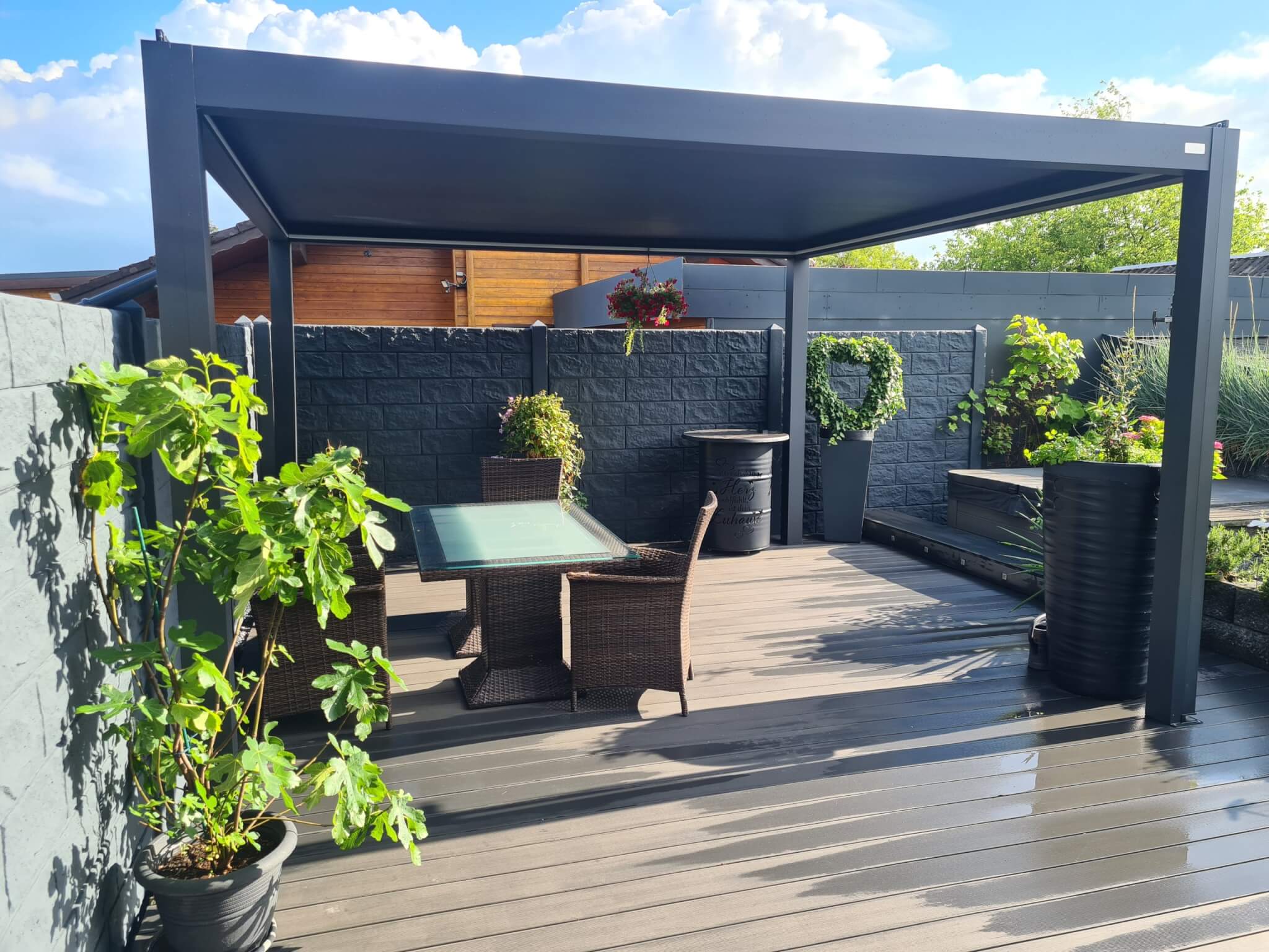 Die HUUN Pergola ist ausschließlich in den Maßen 3x3m, 3x4m, 4x4m, 3x5m und 4x6m verfügbar. Diese festgelegten Standardmaße ermöglichen es uns, erstklassige Qualität zu einem erschwinglichen Preis anzubieten, da individuelle Fertigungen nicht wirtschaftlich wären. Die Standardmaße passen zu den meisten Kundenbedürfnissen und erlauben die Kombination mehrerer Pergolen – zum Beispiel zwei 4x4m Pergolen für eine Fläche von 8×4 Metern. Diese Flexibilität ermöglicht es, nicht die gesamte Terrasse zu überdachen, sondern gezielt bestimmte Bereiche hervorzuheben, wodurch die Pergola nicht nur eine praktische Überdachung, sondern auch ein stilvolles Gestaltungselement wird.
