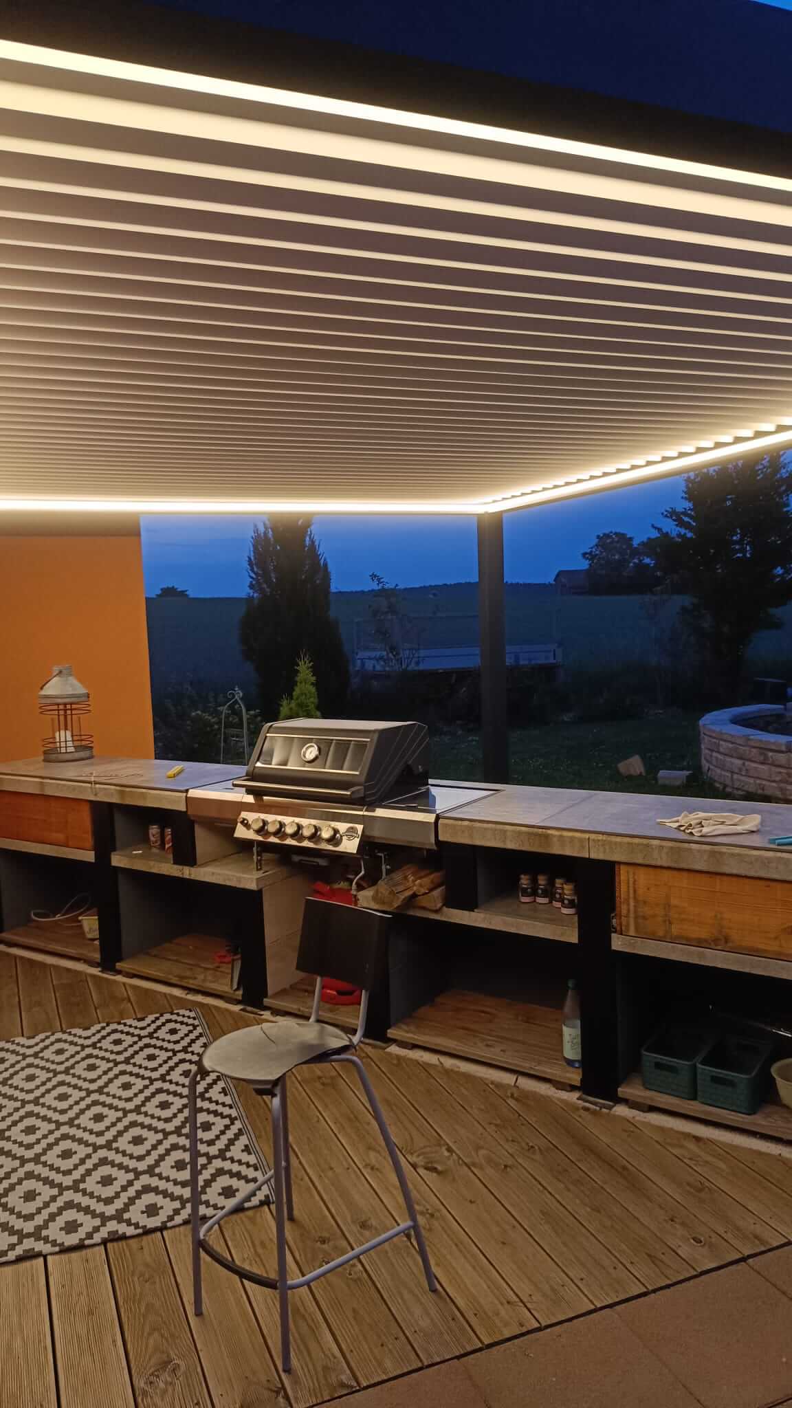 Die LED-Beleuchtung (warmweiß, 3000K, 14 W pro Meter) wird mit der Fernbedienung gesteuert, über die auch das Lamellendach läuft.