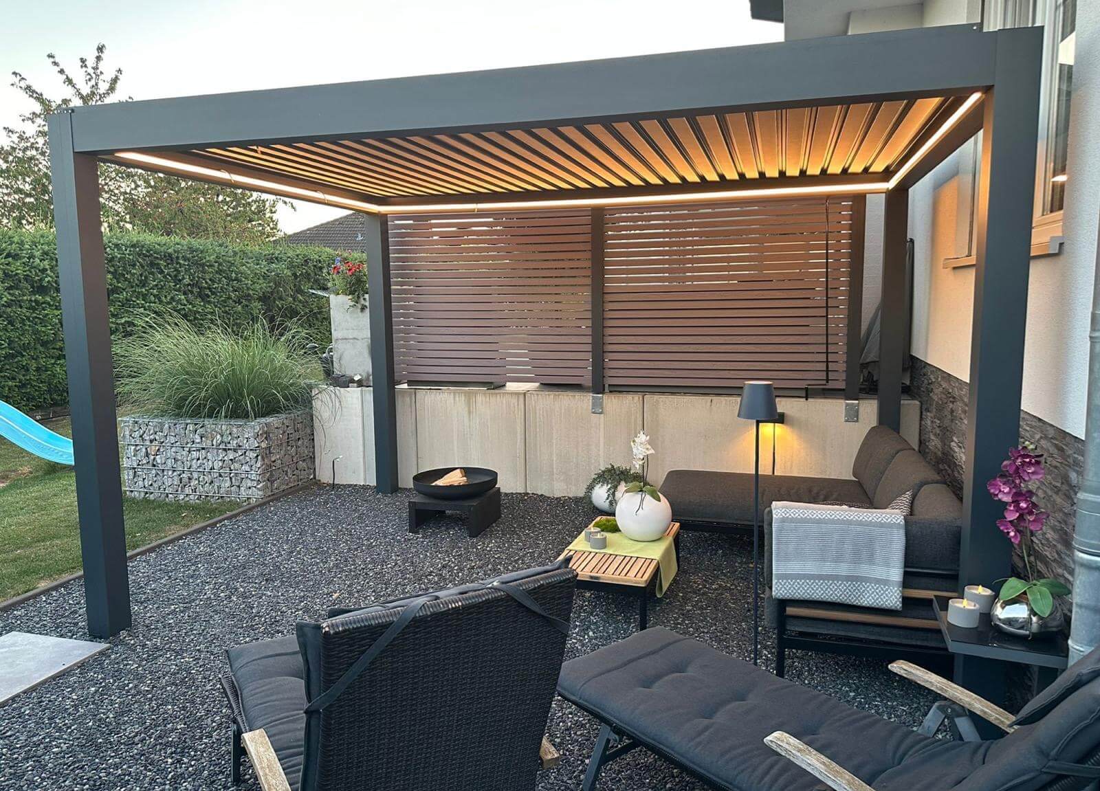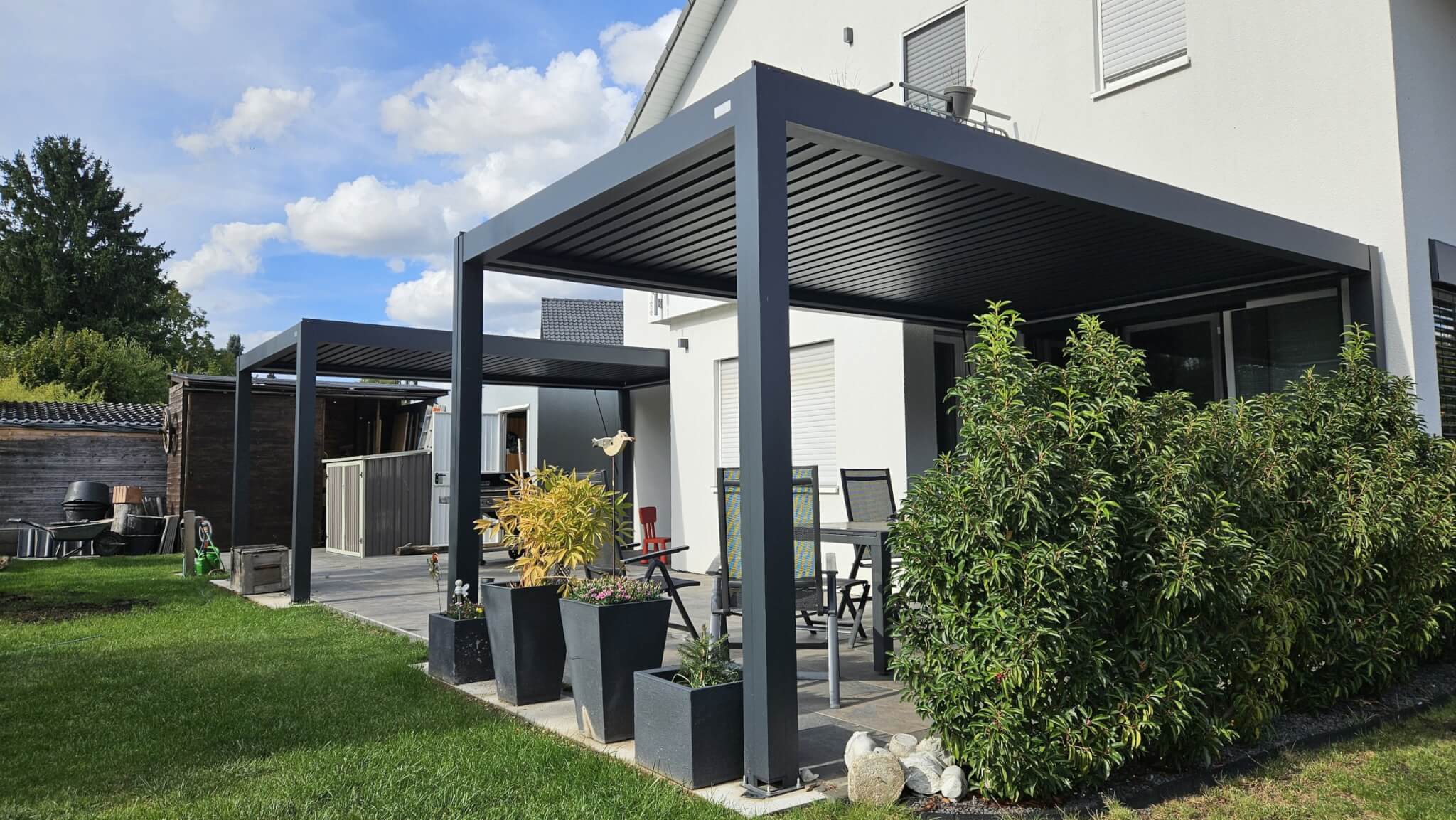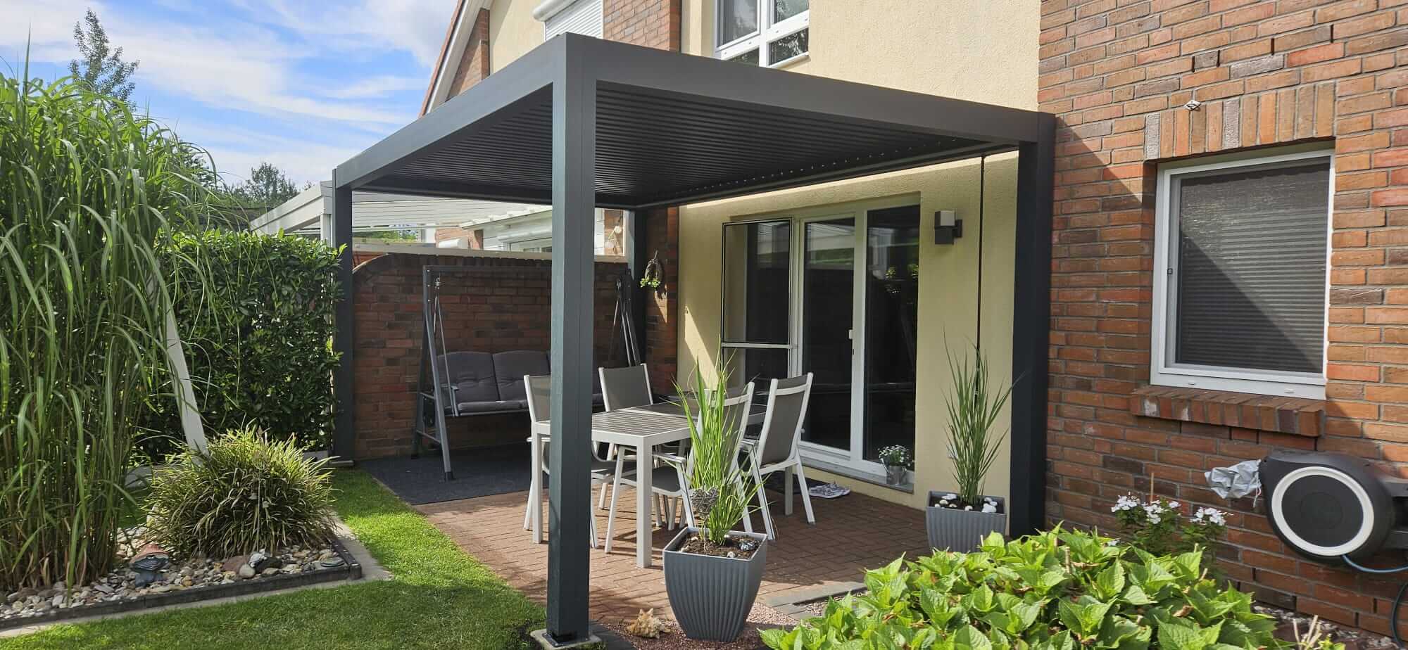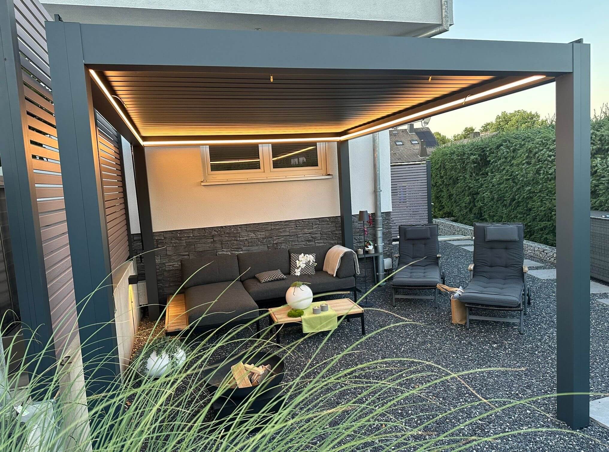 Unsere Pergolen bestehen aus hochfestem, pulverbeschichtetem Aluminium. Dies garantiert absolute Rostfreiheit, UV-Beständigkeit und eine lange Lebensdauer, selbst unter den wechselhaften Wetterbedingungen in Deutschland.