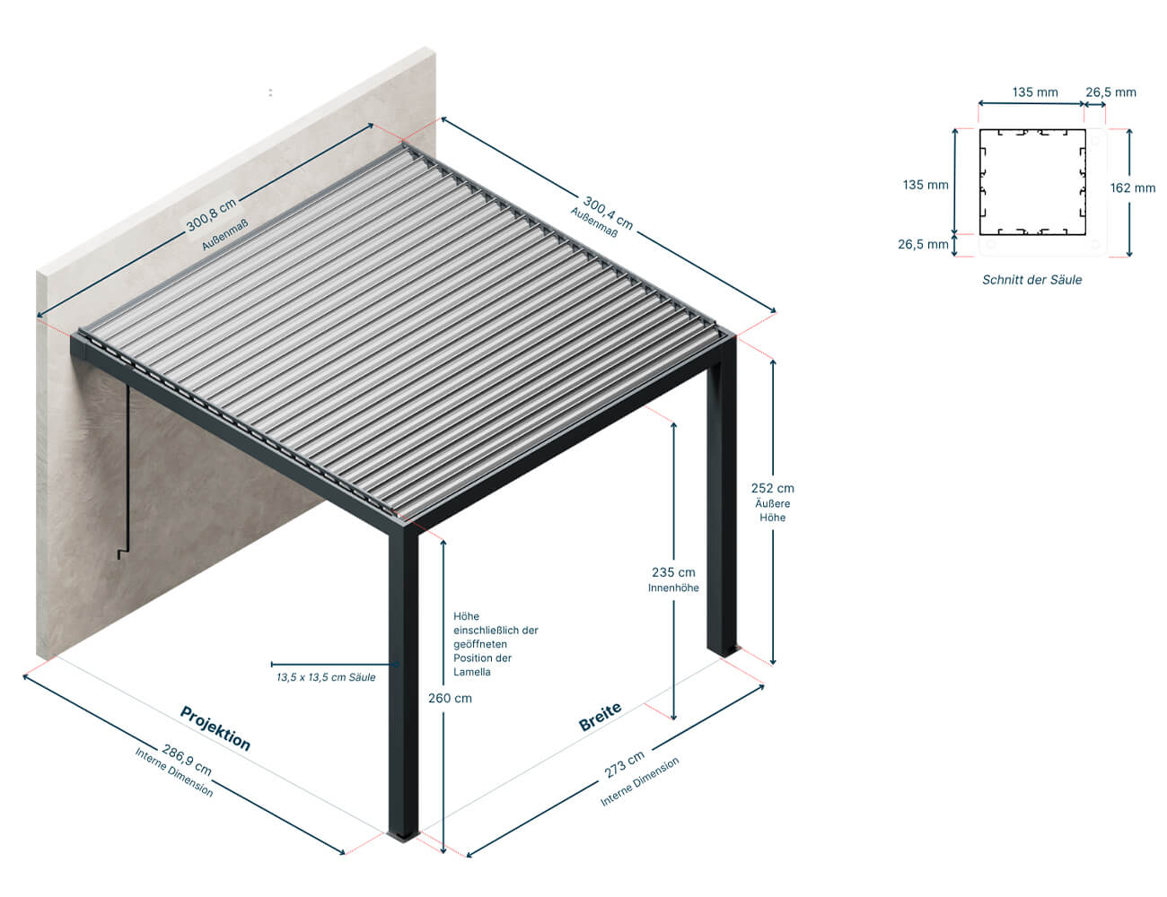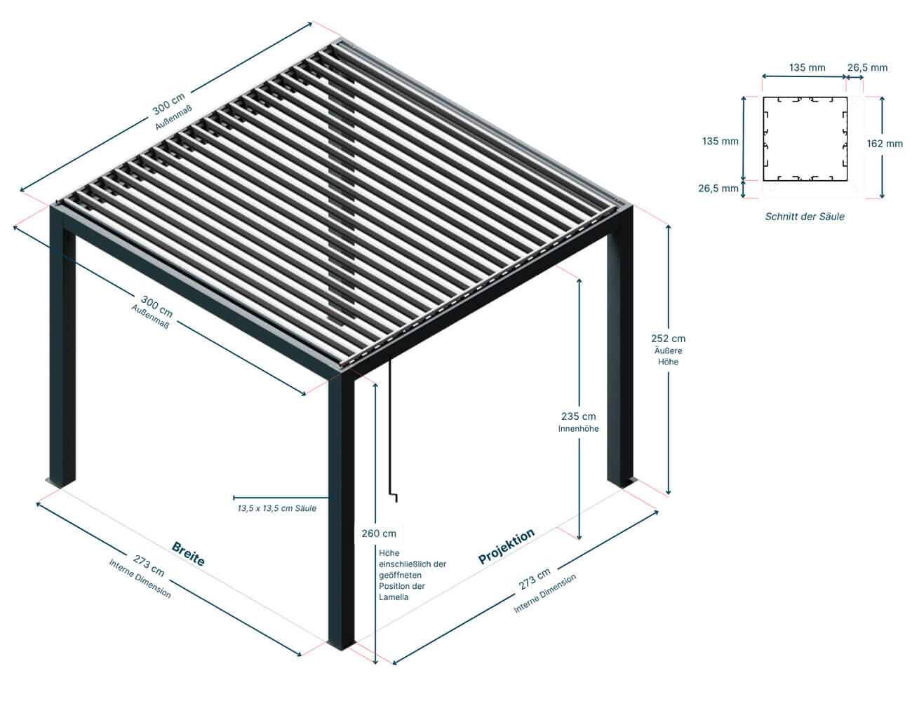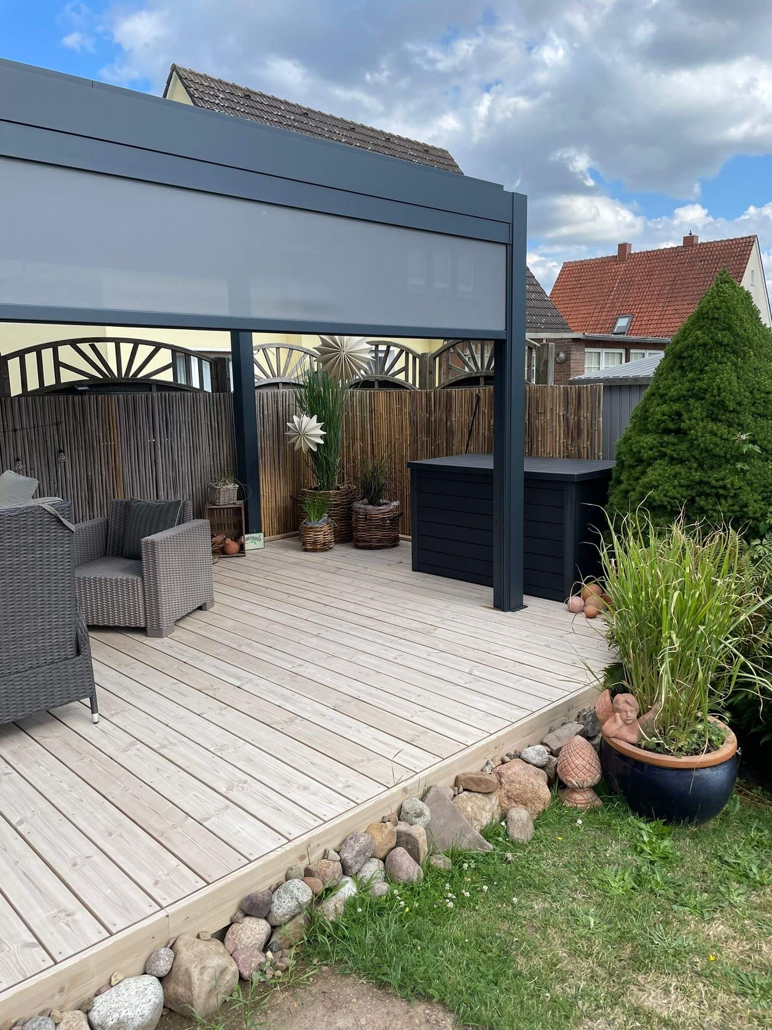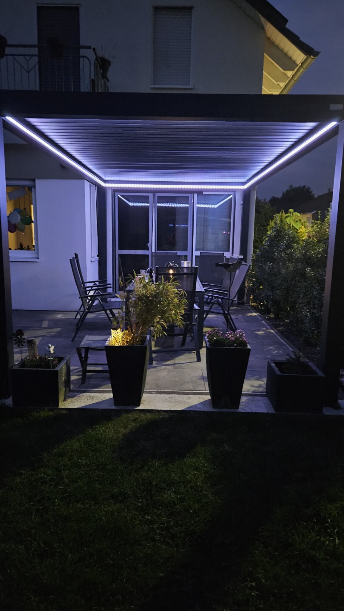 Unsere Pergolen bestehen aus hochfestem, pulverbeschichtetem Aluminium. Dies garantiert absolute Rostfreiheit, UV-Beständigkeit und eine lange Lebensdauer, selbst unter den wechselhaften Wetterbedingungen in Deutschland.