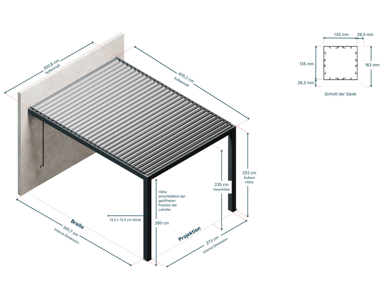 Ja, die Konstruktion ist auf Windstärken bis zu 100 km/h (je nach Modell) und moderaten Schneelast ausgelegt. Wir empfehlen jedoch, die Lamellen bei extremem Schneefall in die vertikale Position zu bringen, um die Last zu minimieren.