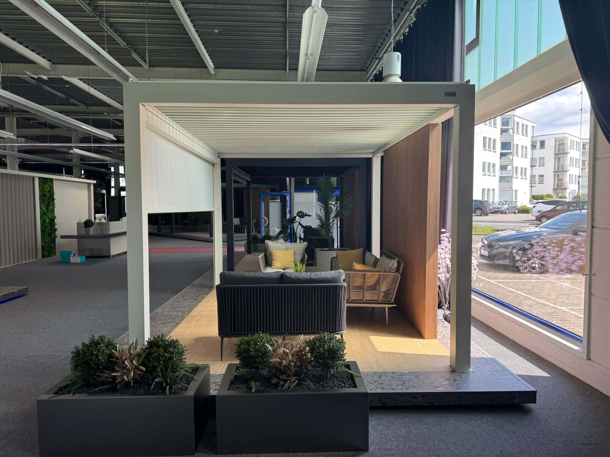 Sehen Sie sich die Pergola nicht nur an, sondern erleben Sie sie. In unserem Showroom können Sie unsere Pergola-Lösungen, die modernes Design, strapazierfähige Materialien und Funktionalität vereinen, aus nächster Nähe betrachten.