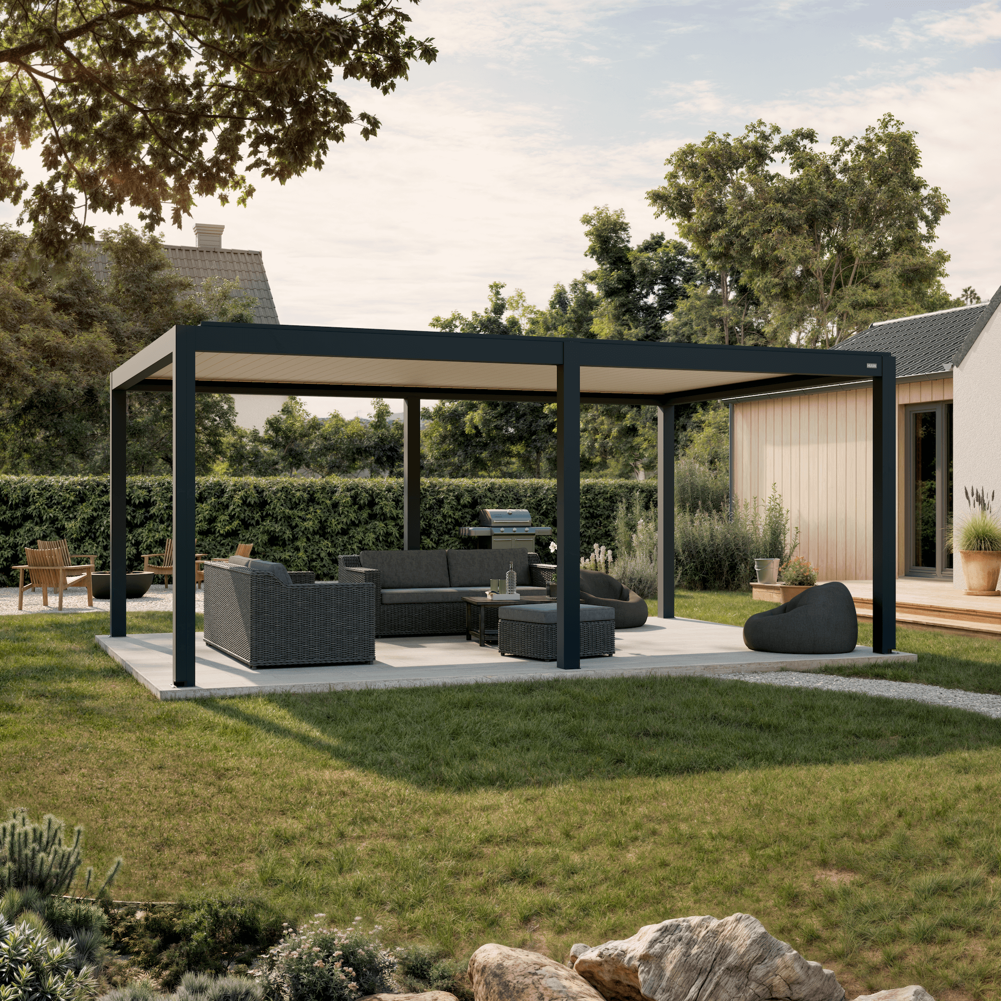 Entdecken Sie unsere hochwertige Pergola mit Lamellendach in 4×6 Metern – die perfekte Kombination aus modernem Design, Funktionalität und Witterungsbeständigkeit. Ideal für Garten, Terrasse oder Poolbereich.